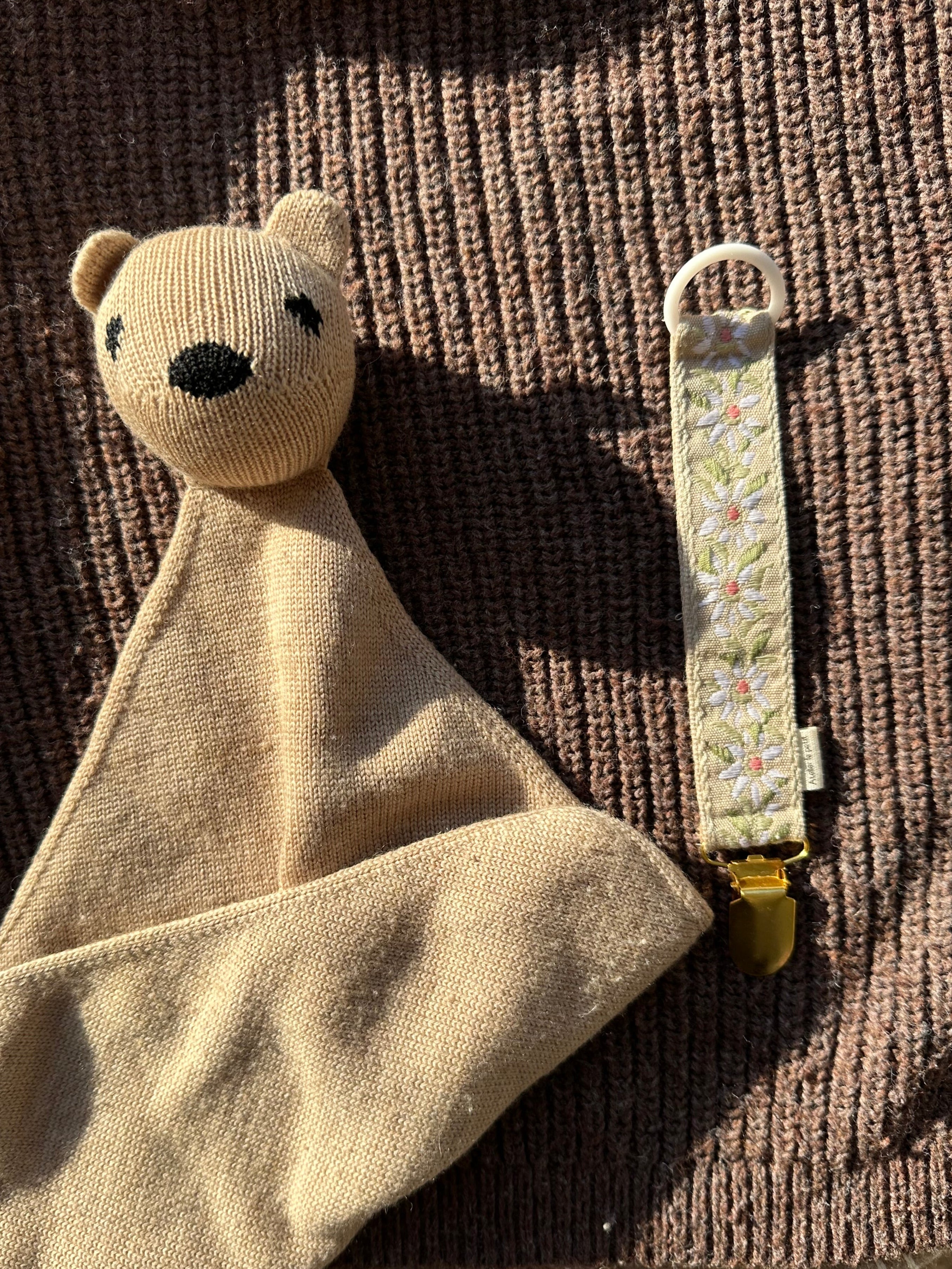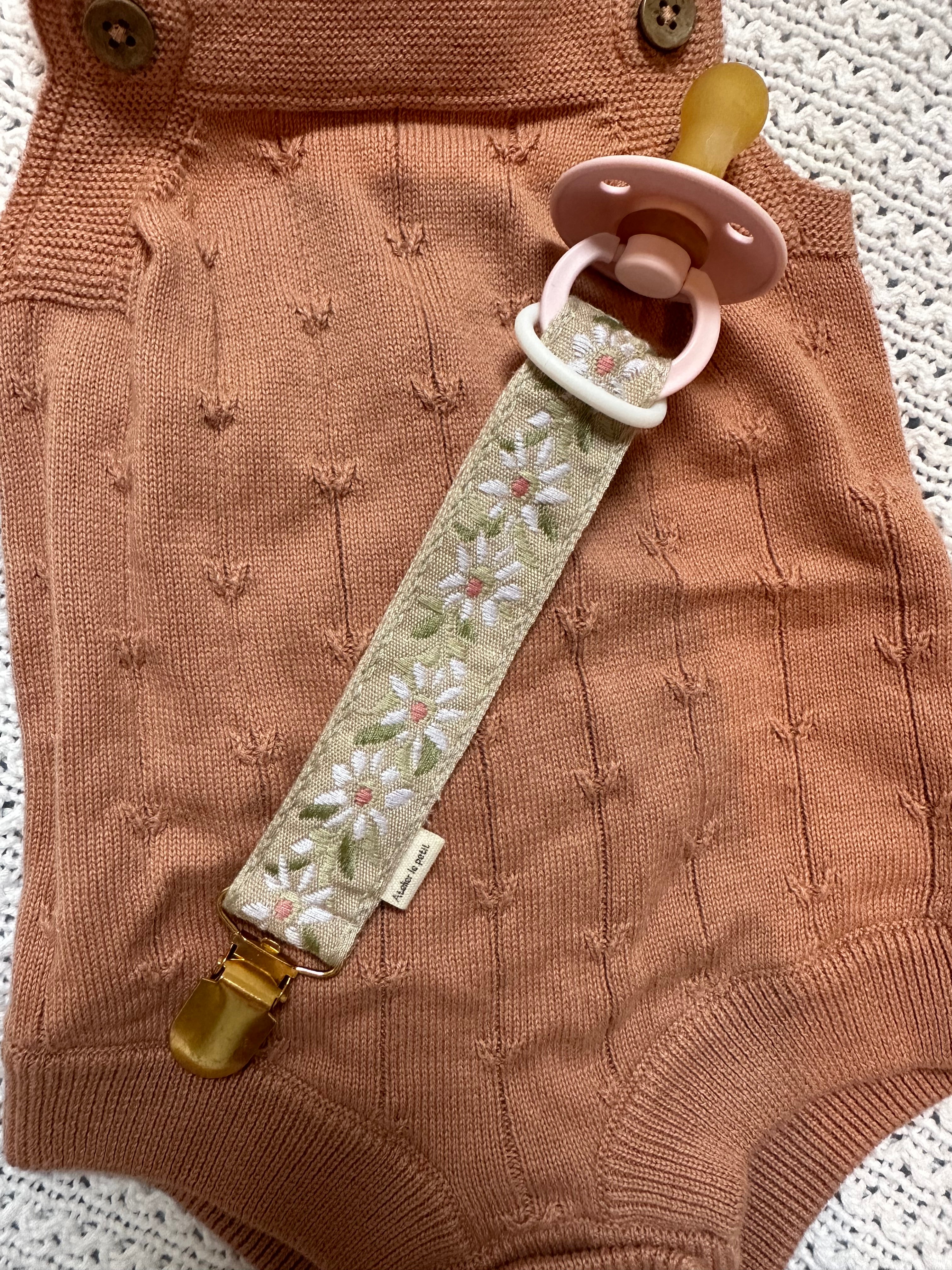 Note: all pacifier clips are made by hand. Because of this they may differ slightly from the pacifier clips shown in the photo.