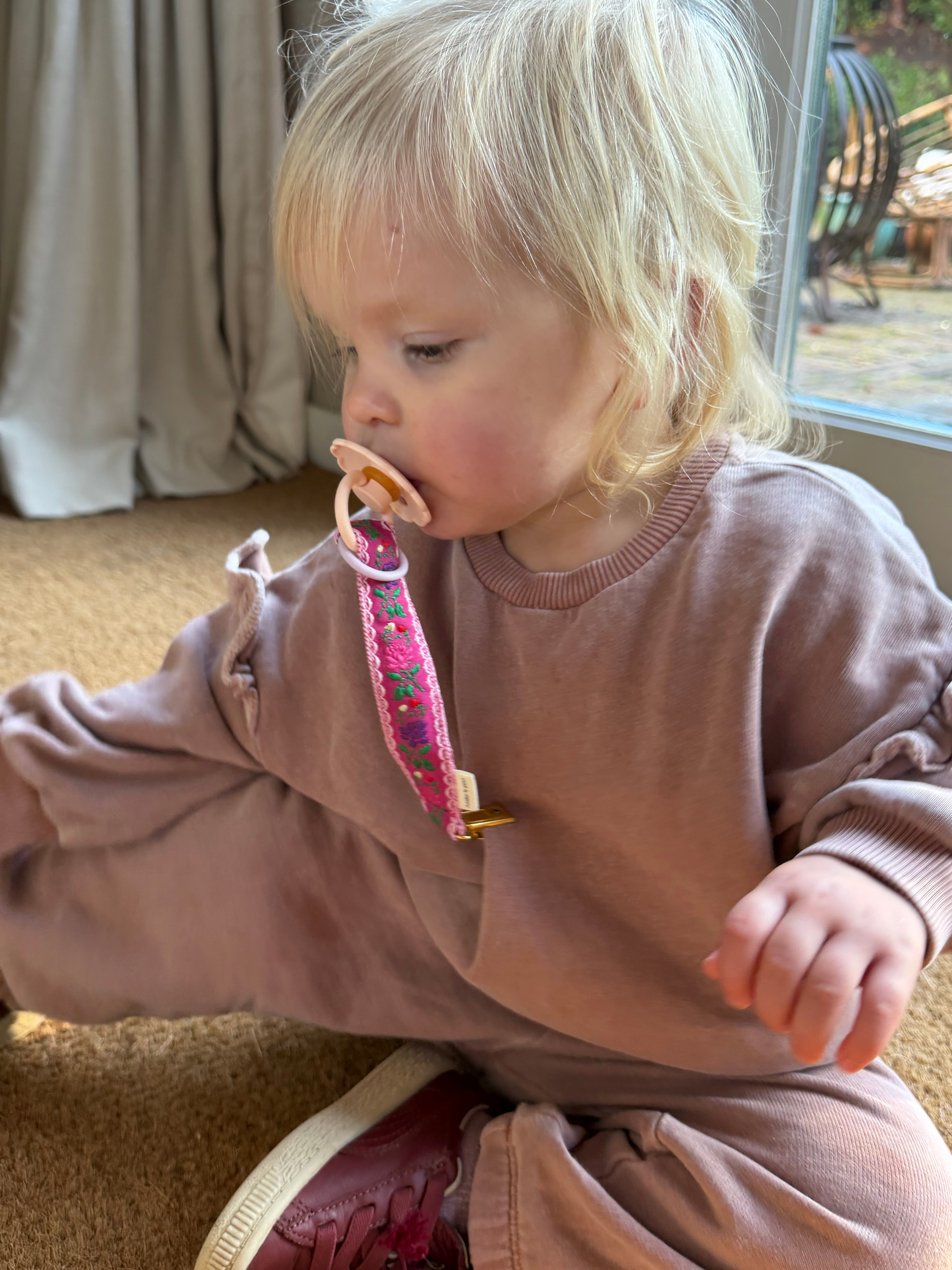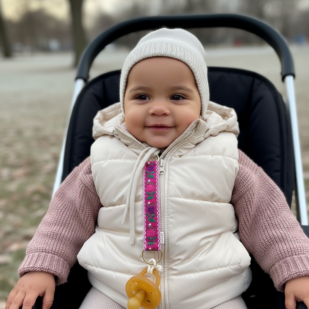 Note: all pacifier clips are made by hand. Because of this they may differ slightly from the pacifier clips shown in the photo.